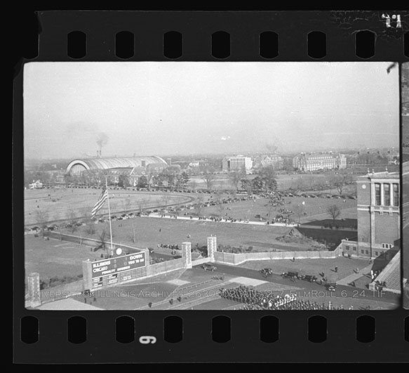 A November 23rd, 1935, band halftime show from the game between the University of Illinois and the University of Chicago is featured. The band is marching off the field after their performance. Due to the volatile nature of Nitrate Film, digital file can be found at: https://medusa.library.illinois.edu/cfs_files/54134790