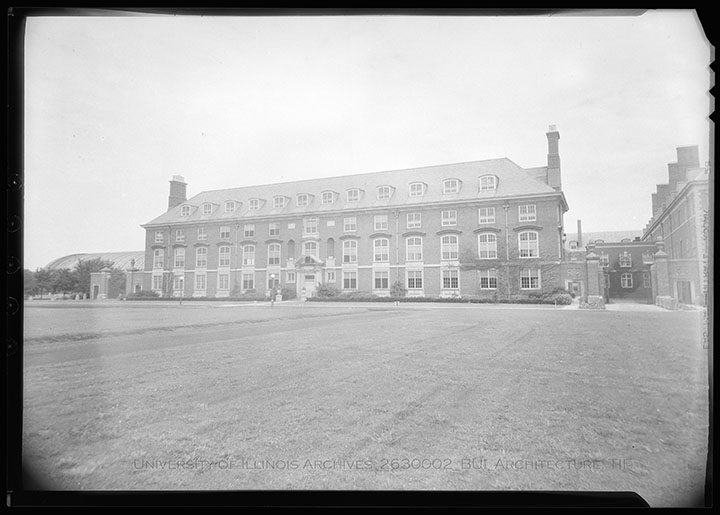 The south-face of the architecture building. On the right is the gateway that separates David Kinley Hall (Commerce Building), and the left features the dome of the armory building. The Architecture building, built from 1926-1928 had its cornerstone placed by Lorado Taft.