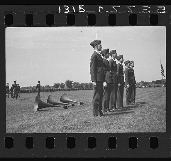 Student soldiers are assembled for the presentation of honors from the Military Day Review Committee (out of frame) Due to the volatile nature of Nitrate Film, digital file can be found at: https://medusa.library.illinois.edu/cfs_files/54134294