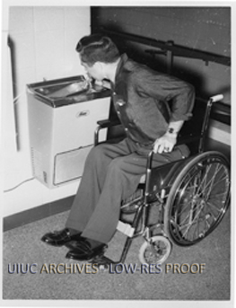 Man in wheelchair accesses drinking fountain | University of Illinois Archives