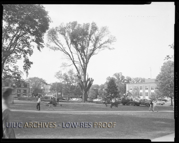 An elm tree in the vicinity of Altgeld Hall is being cut down by University grounds personnel due to Dutch Elm Disease. This view is from the southeast, towards the corner of Green and Wright streets.
