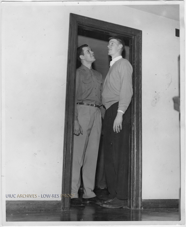 John Kerr (right) stands in doorway, nearly touching the top of the frame with his head. Teammate Bob Peterson looks on.