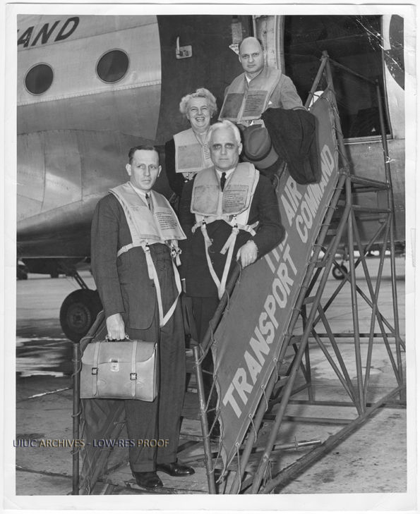 Caption on reverse of image reads: "Hamilton Field, Calif.--Four members of an American education delegation on the steps of an Air Transport Command Skymaster preparatory to taking off for Tokyo. Top to bottom, Chairman George Stoddard, president-elect of the University of Illinois and present New York State Commissioner of Education; Mrs. Pearl Wannamaker, Washington State superintendent of public instruction; Wilson M. Compton, new president of Washington State college; and Gordon T. Bowles, of the State Department's Division of Occupied Areas, who is Far Eastern Adviser to the educators."