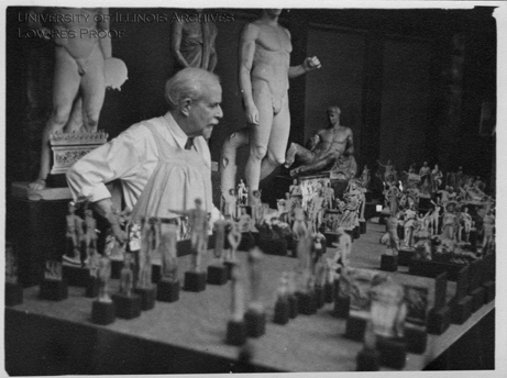 Photograph of sculptor Lorado Taft arranging models on a table.