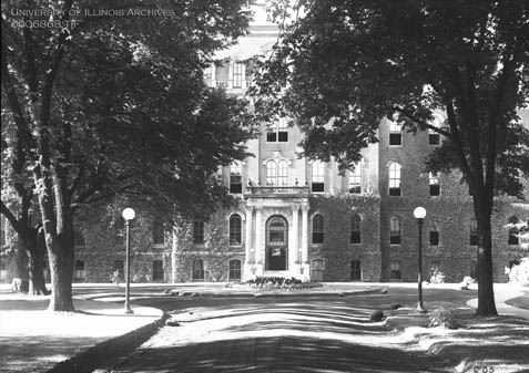 Photograph of the circle drive and main (north) entrance to University Hall, which stood just south of the present-day location of the Illini Union.