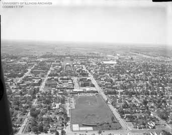 Aerial photograph of the Urbana-Champaign campus as seen from the north.