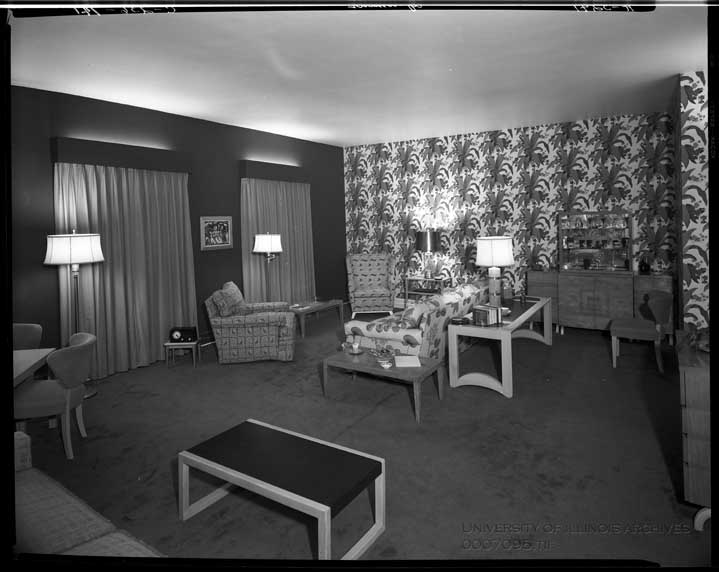 Black and white photograph of an interior apartment in Allerton House. This living room space is part of a guest room. Allerton House is complete with 40 guest rooms and can house up to 100 people.