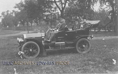 Military officers seated in early 20th century automobile with what appears to be a track with hurdles on it in the background.
