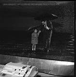 Professor Ven Te Chow, of the Department of Civil Engineering, standing in a rainmaker with a child and holding her hand. Both are holding umbrellas.