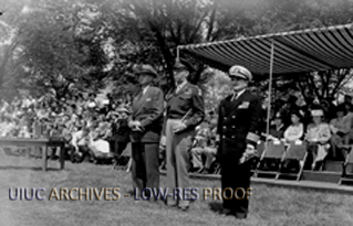 Caption on back: Armed Forces Day -- L to R -- President George D. Stoddard; Colonel Harry A. Buckley, ROTC commandant; Captain Leland R. Lampman, ROTC commanding officer, reviewing cadets and midshipmen at first Armed Forces Day to be held at Unversit