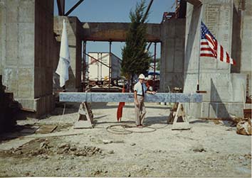 A man poses with a large beam at the Beckman Institute construction site.