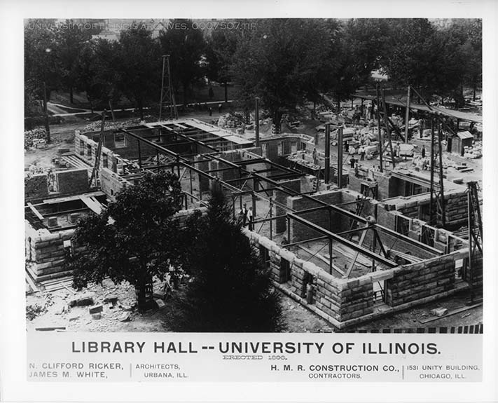 Captioned: Library Hall -- University of Illinois. Erected 1896. N. Clifford Ricker and James M. White, Architects, Urbana, Ill. H.M.R. Construction Co,, Contractors, 1531 Unity Building, Chicago, Ill.