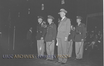 Caption on back: Reviewing officers at Military Day. Left to right -- Cadet Colonel (1941 - 42) Gerald W. Homann, Mattoon; Colonel Leonard C. Sparks, commandant; President Arthur Cutts Willard