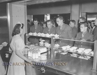 Caption on back reads, "Good food and plenty of it is served in the cafeteria of the Illini Union building at the University of Illinois to soldiers in the Specialized Training Assignment and Reclassification School there."