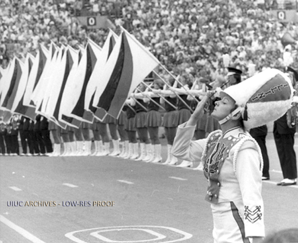 Caption on back reads, "Debbie Ann Soumar, first woman drum major in the Big Ten, stands at attention as the Marching Illini Band plays and the Flag Corps dips the flags."