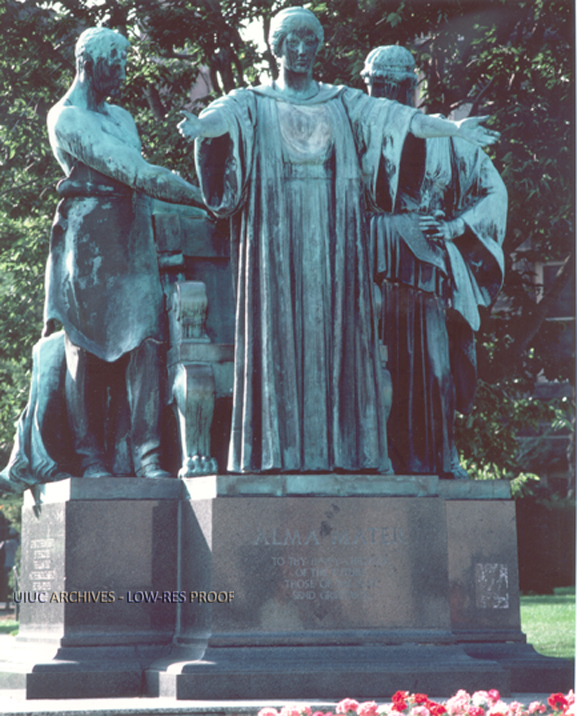 Color photograph of the Alma Mater group by Lorado Taft on the University of Illinois campus.