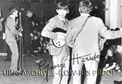 The Beatles perform on stage. Lennon singing in background. Harrison turns to the camera. Signed by George Harrison.