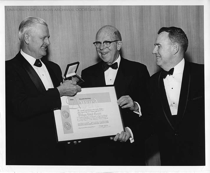 William L. Everitt, dean emeritus, College of Engineering, University of Illinois at Urbana-Champaign, becomes 48th recipient of the Washington Award of the Western Society of Engineers. With him at the ceremony in Chicago are Warren A. Baxter (left), manager, electrical and electronic service, Chicago District, General Electric Co., president of the society, and Frederick G. Jaicks (right), president, Inland Steel Co., Chicago, chairman, Washington Award committee.
