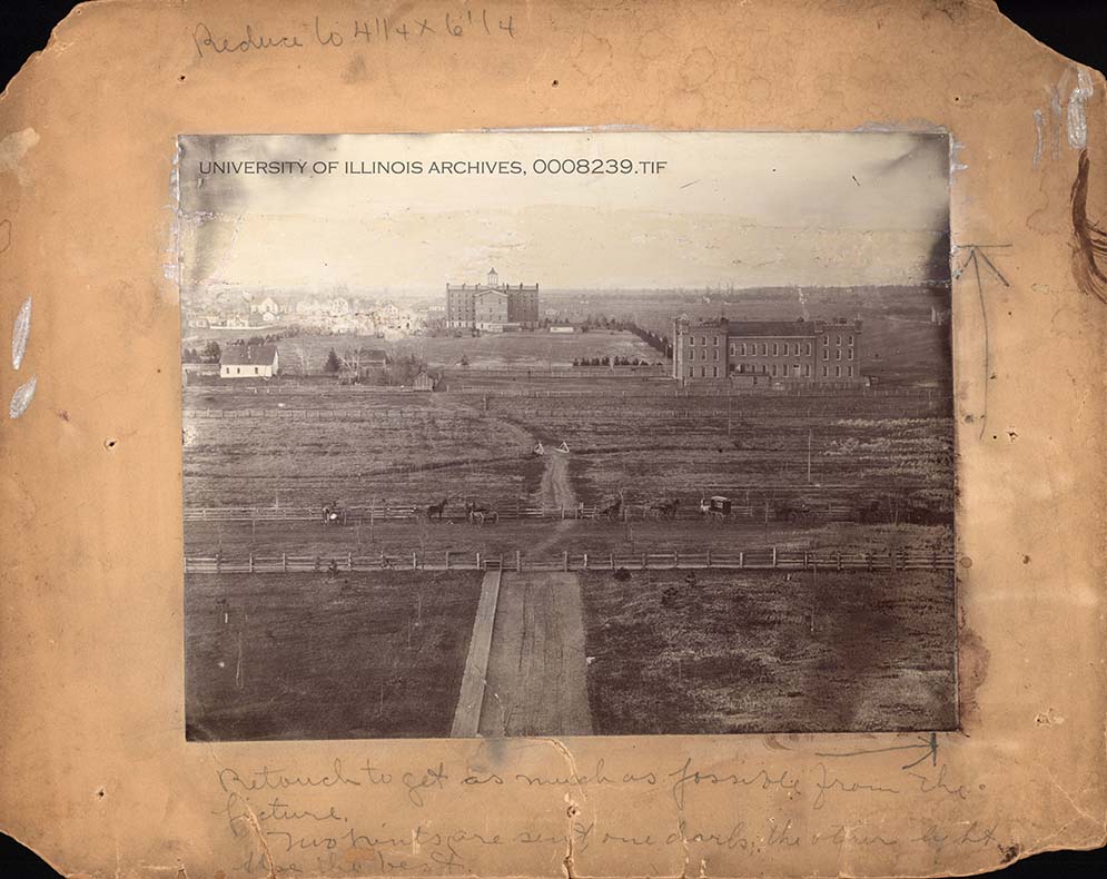 Photo shot from south of Green Street looking north across Green Street, the Silver Creek (Boneyard Creek), and the Champaign and Urbana Horse Railroad with the University Building ('The Elephant') in the center-left of the background and the old Mechanical Building in the center-right. Note: this scan is of the oldest known instance of this iconic image. It was made in 2019 from an original that at some point in the past (perhaps as early as ca. 1918) the image had been manually retouched to darken the lines of the Boneyard Creek, the roofs of the barns on the left, the 'Elephant,' and the armory on the right. In 2017, a photograph conservator removed the earlier retouching paint.
