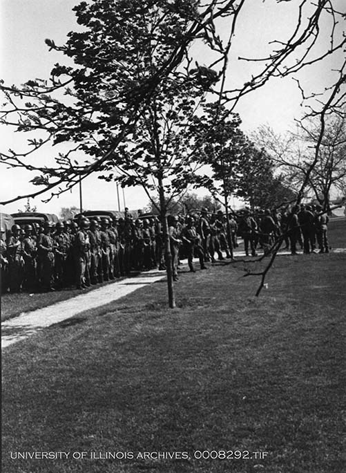 Police and National Guard were called in to respond to the student strike and demonstrations of Spring 1970. Here, they are gathered at 1st Street and Florida Avenue.