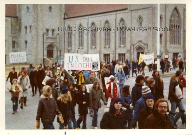 Protestors with signs march against the Vietnam War and Nixon's second inauguration. Urbana First United Methodist Church in the background to the southeast.