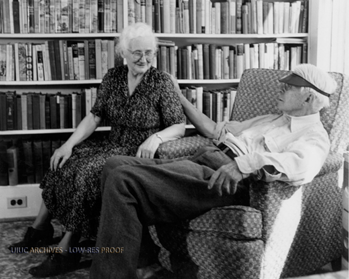 Carl Sandburg seated in armchair, next to woman, possibly wife, bookshelves behind them.