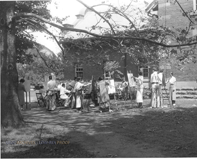 Students draw, outside, from a live model | University of Illinois Archives