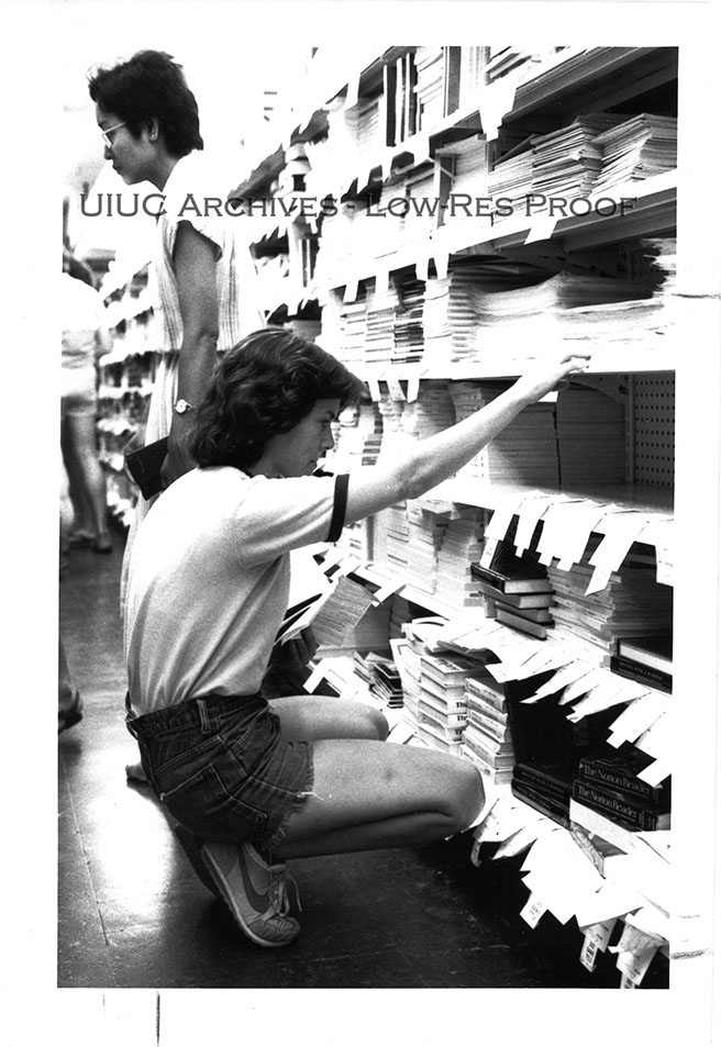 Two students search for textbooks in an aisle of the Illini Union Bookstore.