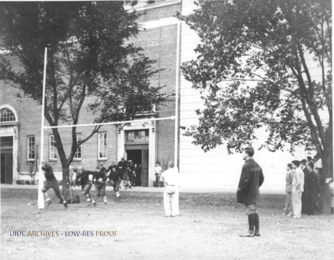 Coach Zuppke and a crowd of students watch as 1935 football team runs out of locker room onto practice field
