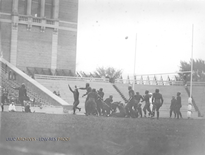Illini Football players practice in an empty Memorial Stadium, punter kicks a field goal. | University of Illinois Archives