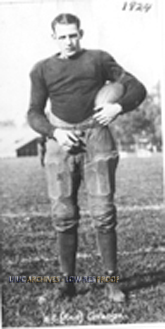 H.E. (Red) Grange, 1924 poses with football under his arm, looks straight at camera
