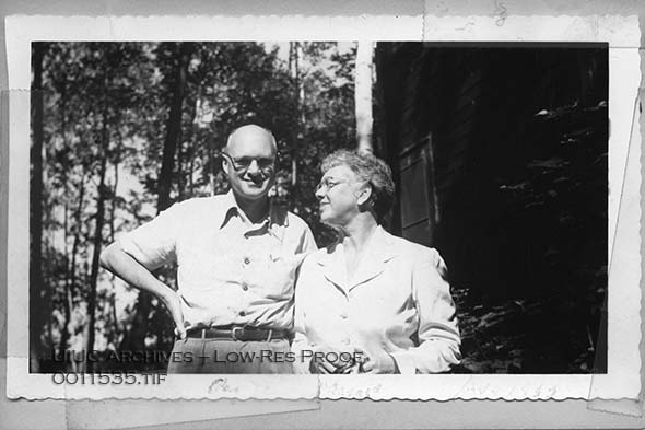 Former University of Illinois president George D. Stoddard and his wife, Margaret, stand by what appears to be a cabin in a wooded area.