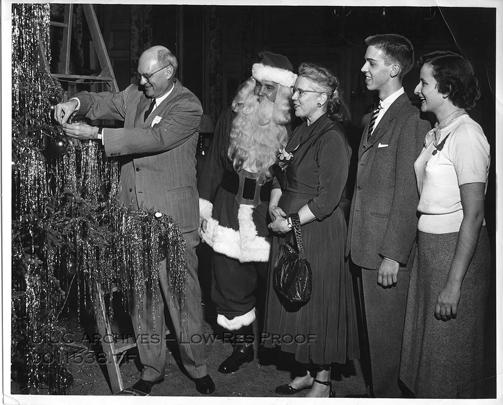 University of Illinois President George D. Stoddard hangs an ornament on a tinsel Christmas tree as his wife Margaret, a man in a Santa Claus costume, and two students look on.