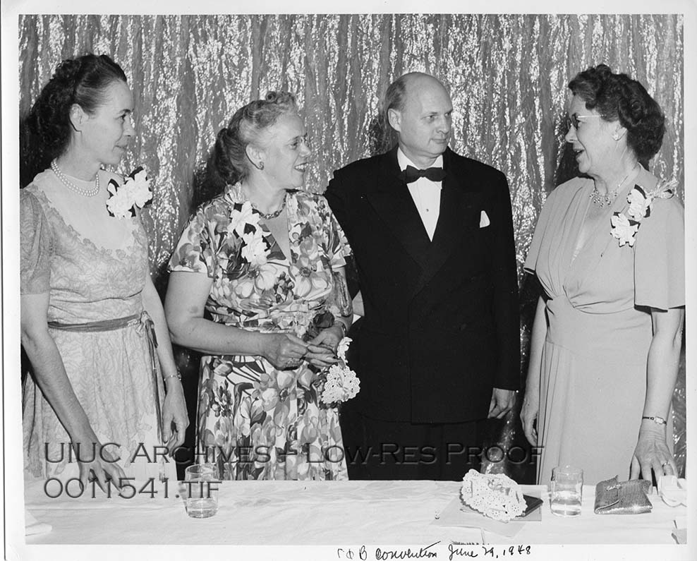 University of Illinois president George D. Stoddard and his wife Margaret speak with sorority members at the Gamma Phi Beta Convention.