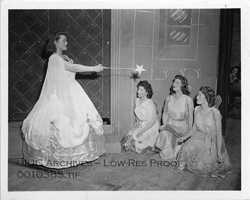 Caption on back reads: "Queen of the Fairies and her close followers in the University of Illinois student production of Gilbert and Sullivan's "Iolanthe". The queen is Patricia Lewis, Tolono. The Fairies left to right, are: Maurine Roske, Mt. Carroll, Jean Miller, Wilmette, and Doris Wright, Urbana."