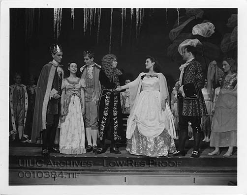 Caption on back reads: "Lord Chancellor and Fairy Queen clash in spirited words as University of Illinois students present Gilbert and Sullivan's "Iolanthe." Left to right are: Paul Bischoff, St. Louis, one of the noblemen seeking the hand of Phyllis, played by Marilyn Skiles, Mt. Carmel, who is second, and flanked on the other side by Eden Nicholas, Springfield, another nobleman; Byron Riggan, East St. Louis, as Lord Chancellor, faces Patricia Lewis, Tolono, fairy queen; while behind her is Strephon, in love with and loved by Phyllis; and Iolanthe, his mother and one of the fairies, played by Sarah Jean Gray, Champaign."