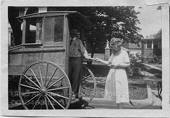 A postman delivers mail to a woman from the back of a carriage.