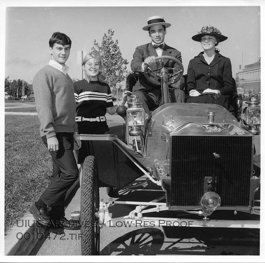 Two students in historical dress sit in a Ford Model T on South 1st Street in Champaign. Two more students in modern dress stand beside the car. Memorial Stadium is visible in the background to the right.