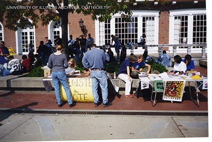 Student members of the Volunteer Illini Project work the Project Vote campaign in 1996