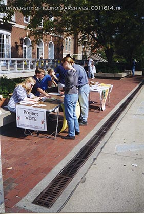 Student members of the Volunteer Illini Project work the Project Vote campaign in 1996