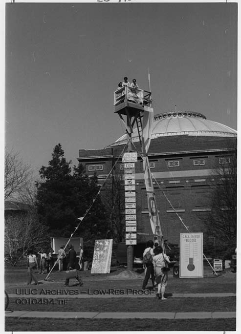 Students from Theta Xi and Alpha Chi Omega stand on an elevated platform outside of Foellinger Auditorium during a fundraising drive for multiple sclerosis.