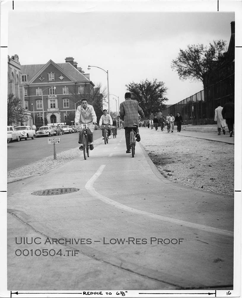 Cyclists ride on a designated bike path on E Armory Ave. More people walk along the sidewalk to the right. Gregory Hall is visible in the left background.