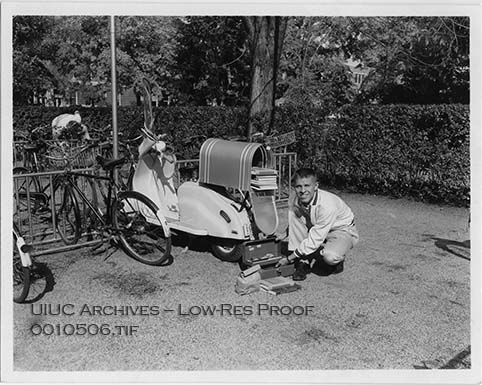 A student kneels by a motor scooter parked at a bicycle rack. The scooter has a mailbox full of books affixed to its rear half. Caption on back reads: "A farm mailbox replacing rear seat and spare tire on his motor scooter solves the problem of where to safely carry everything from books and engineering drawing equip. to lunch and raincoat for Jerry R. Weibel, 805 W. Washington St, Champaign, frshman [sic] in the University of Illinois. Weibel, an ingenious agricultural engineering student, fitted brackets into holes where seat and tire holder had been fastened. A plywood platform supports the mailbox. In it he carries raincoat, hat, tarpaulin, lunch tackle box of drawing instruments, and an extra large amount of books because he is a naval science student."