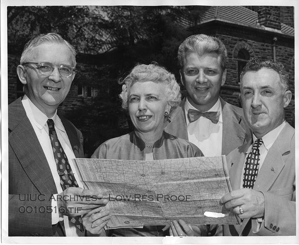 Four people pose near Altgeld Hall holding a map. Caption on back reads: "Coming to Chicago for the Tuesday (June 23) meeting in the LaSalle Hotel being sponsored by the University of Illinois Dads Association for prospective University students and their parents will be (left to right) D. A. Grossman, examiner in the Office of Admissions and Records; Miss Agnes G. Tandberg, associate dean of women; S. W. Rahn of the University Housing Division; and E. E. Stafford, dean of men. The meeting, scheduled for 8 p.m. (CDT) is in charge of Samuel Shkolnik, 7737 Essex Ave., Cook County chairman of the association. It is one of 14 being held throughout the state. --University of Illinois Newsphoto from Joe Wright"