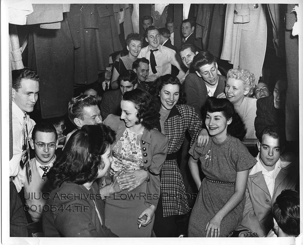 Students fill a train car. Caption on back reads: "GALESBURG, Ill., Dec. 19--No crowded railroad stations for vacation-bound students at the Galesburg Division of the University of Illinois as they stepped from campus classrooms directly into a private train provided by the Burlington railroad. University officials made the arrangements with the railroad after 'discovery' of a forgotten spur track which cuts across the University campus. The special student train, with a snack bar included, later switched to a through track to Chicago's Union Station arriving there at 9 p.m. Friday (Dec. 19) after stops at Kewanee, Princeton, Mendota, and Aurora. University students have a 16-day Christmas furlough which began after classes today (Friday, Dec. 19) and ends Monday Jan. 4."