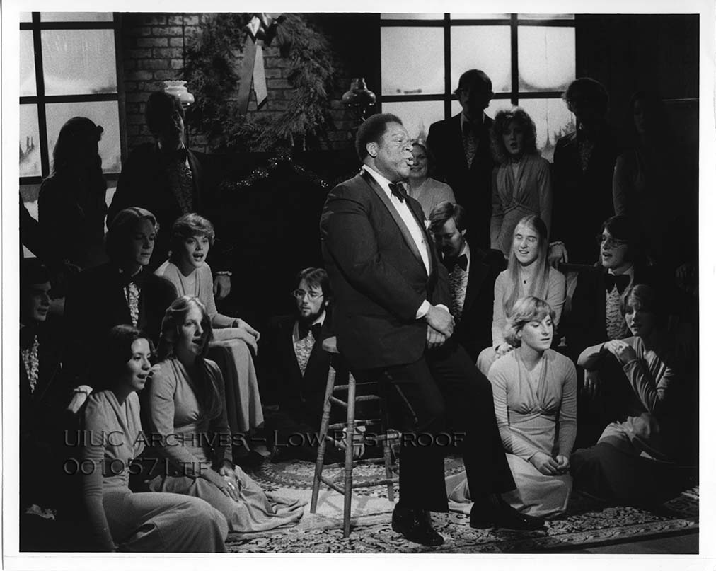 Caption on back reads: "Bass-baritone William Warfield joins the University of Illinois Madrigal Singers in a program of holiday music on the color television and radio special, 'How Far Is It to Bethlehem?'"