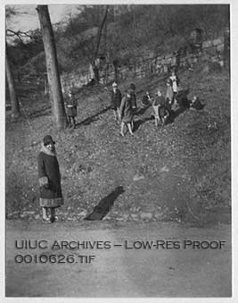 A group of people are gathered near the side of a road. A woman who may be Helena Tykociner stands closest to the camera, right at the road's edge.