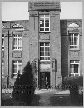 Exterior view of the front of a brick building, the Extension of the Institute of Physics in Goettingen, with someone standing in its open doorway. The inscription over the door reads "Erbaut [built] 1905."
