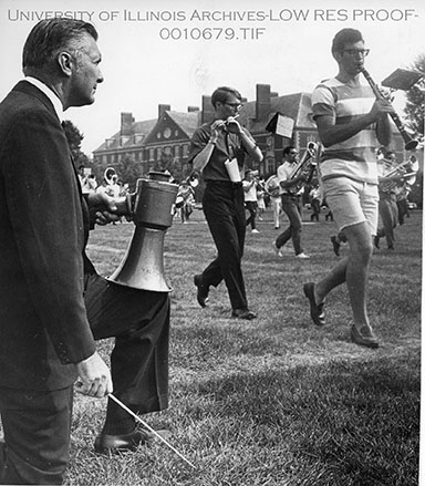 Band Director Everett Kisinger observes band members playing the clarinet and Flute while holding a megaphone. In the background, Mumford Hall is featured.