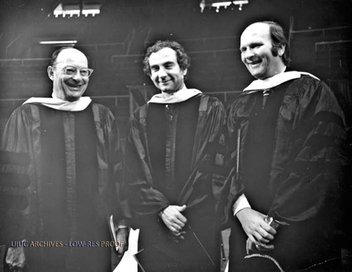 John Bardeen, Leon Cooper, and Robert Schrieffer, 1972 Nobel Prize winners in Physics at the 1974 Commencement Exercises | University of Illinois Archives